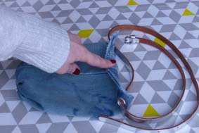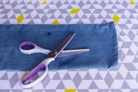 | Pick one leg of your jeans! Pinking shears are those scissors with the zig zag blades. Cutting with them stops fraying, but if you don't have pinking shears, use normal scissors and stick your bag in the wash before you put the belt on. You'll get a shaggy soft finish on the edge. NB this only works on denim! | |