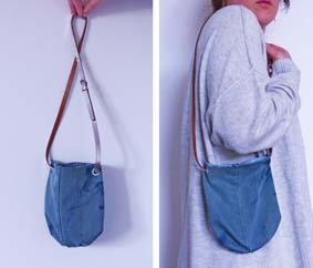 This denim pouch-bag is minimal, practical and very fast to make. You need an old pair of jeans, a pair of scissors (or ideally pinking shears) a skinny belt, a rubber band, and a pair of extra large rivets. Superglue is optional. |
