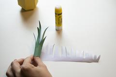 Glue or tape the white tabs, and stick them to the back of yellow tabs to create the curved sections at the top and bottom. Don’t tape up the long side of the pineapple yet |